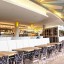 The columns are important links between the internal landscape of the restaurant, and the natural harbourside landscape. The columns are architectural trees, clad with a modern floral mosaic tile, and branched with industrial Lingotto light fittings designed by Renzo Piano. Arranged in Futurist inspired geometry, the multi-coloured ceiling panels above form a canopy of “foliage” and “sky”.